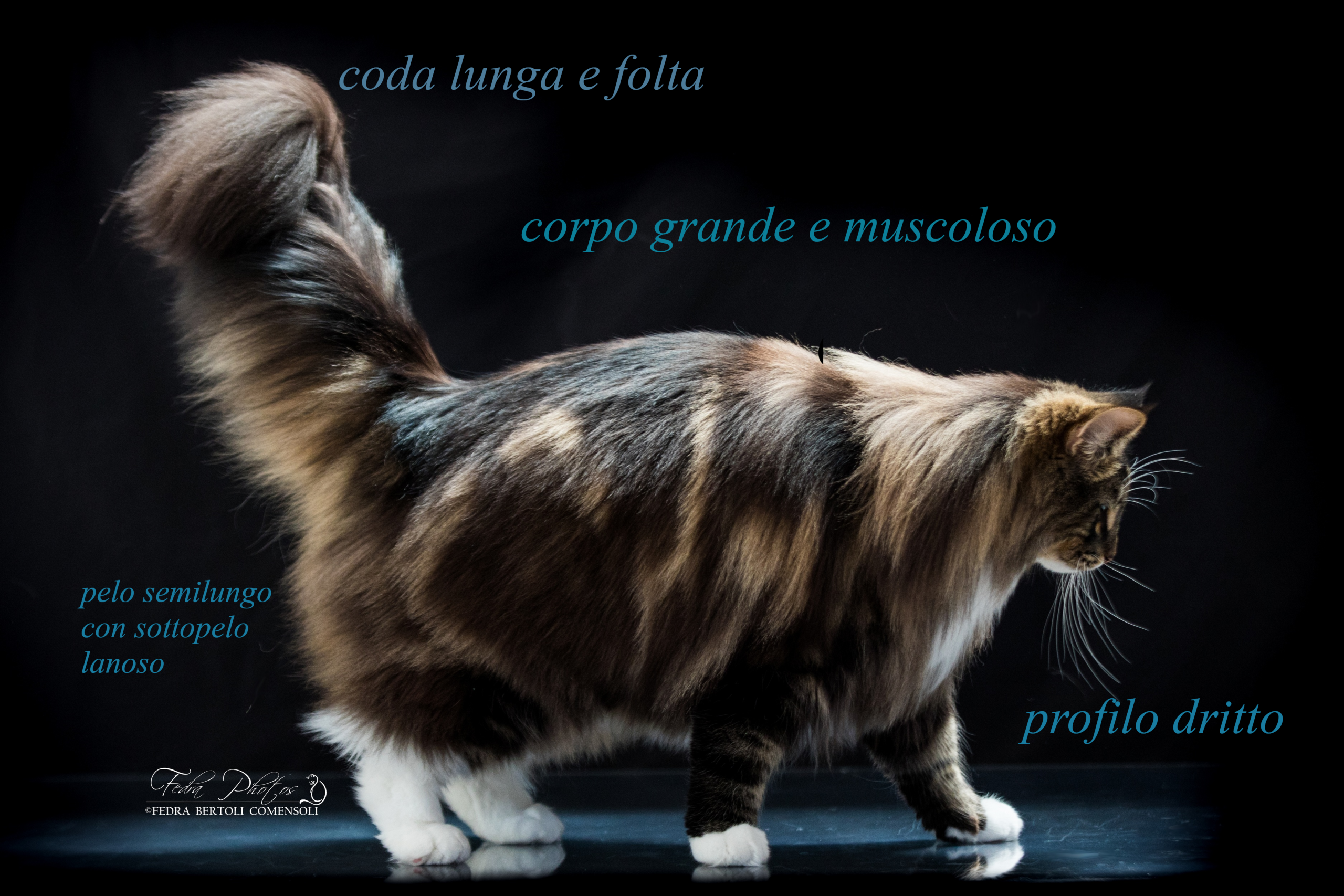 La coda è molto lunga e pelosa: deve arrivare almeno alle scapole, preferibilmente al collo.